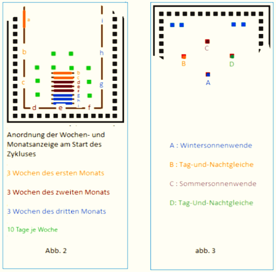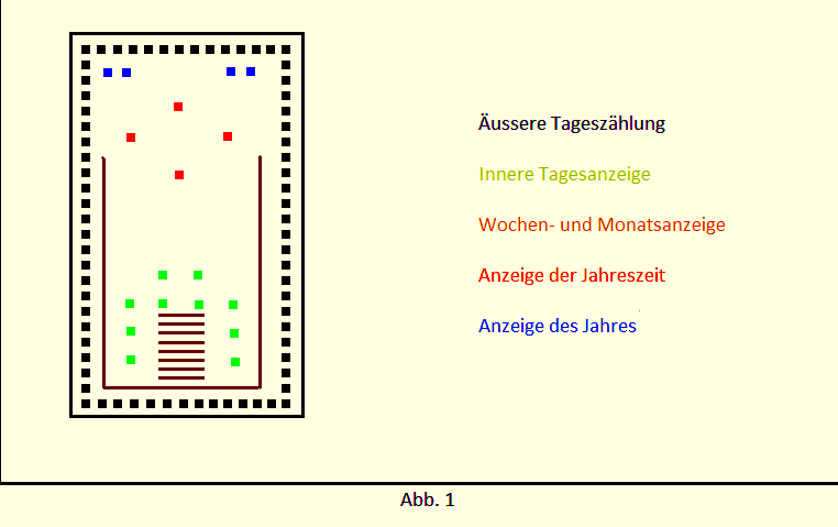 Auf diesem Artefakt finden sich verschiedene Feldergruppen (Abb. 1) wieder die einerseits Parallelen zum Ägyptischen Kalender aufweisen und andererseits Unterschiede zu diesem, die auf eine zweckmäßige Eigenentwicklung schließen lassen.